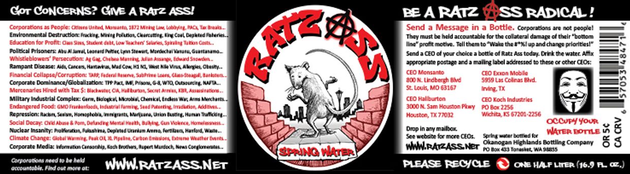 Corporations don't give a Ratz Ass about anything but profit. In the meantime they trample over us and the earth creating chaos and unbalanced life. We must insist the Corporation 's are not people. We must take the power away from them and return it back to the people. Our water gives you a vehicle to express yourself by using your empty bottle as a mailing tube to send a "Message In A Bottle" to CEO's from such powerful corporations as Exxon Mobile, Montsanto and Amazon .Become a Ratz Ass radical today!